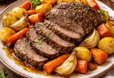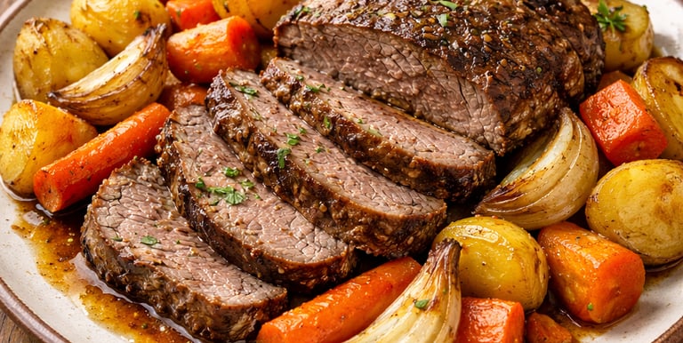 Carne cocida al horno con vegetales variados.