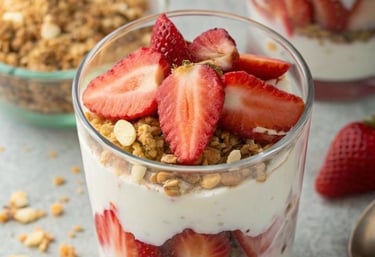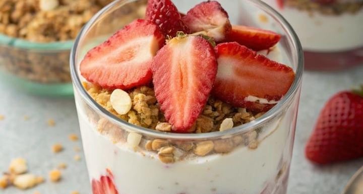 Vasito con avena, yogurt y frutas.