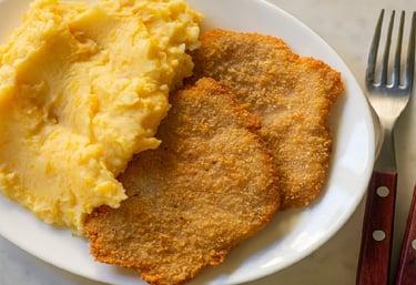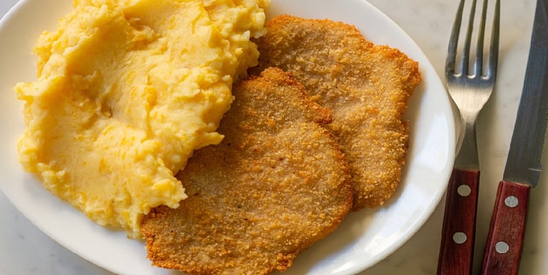 Brochettes de cerdo y vegetales con puré de calabaza.